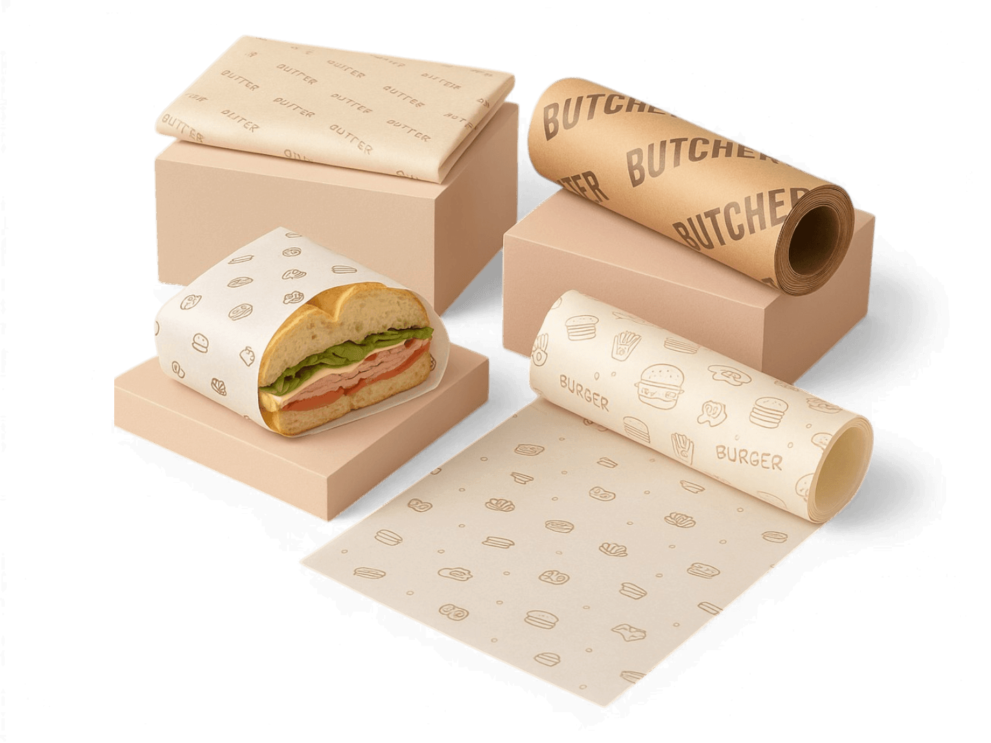 Custom wax paper is a food safe wrapping paper with all your branding elements printed on them. You can get them in custom sizes. We offer them in both sheets & rolls format.